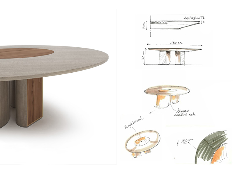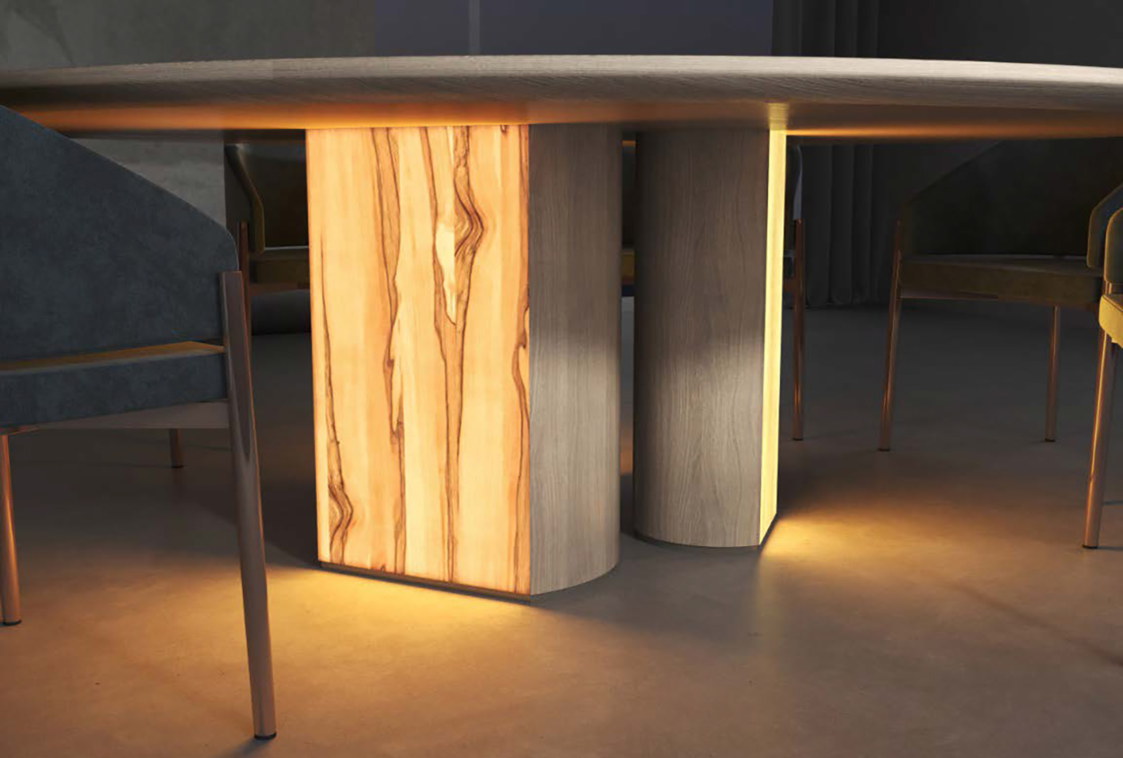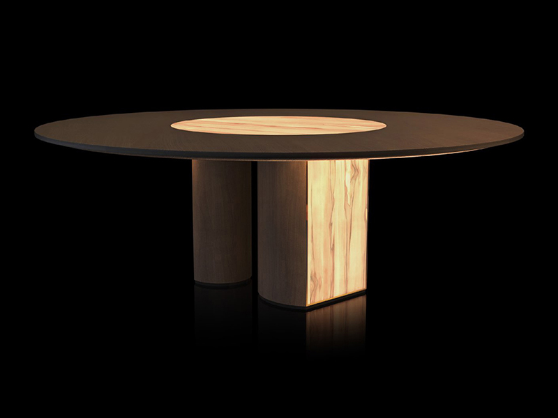 La sinuosità delle forme circolari è spezzata da piani illuminati che sembrano tagliare un tronco e svelarne l’anima al suo interno. Le scultorie gambe del tavolo Teseo in versione Circolare esaltano la potenza del legno Brightwood® e rendono il pezzo unico e caratteristico.